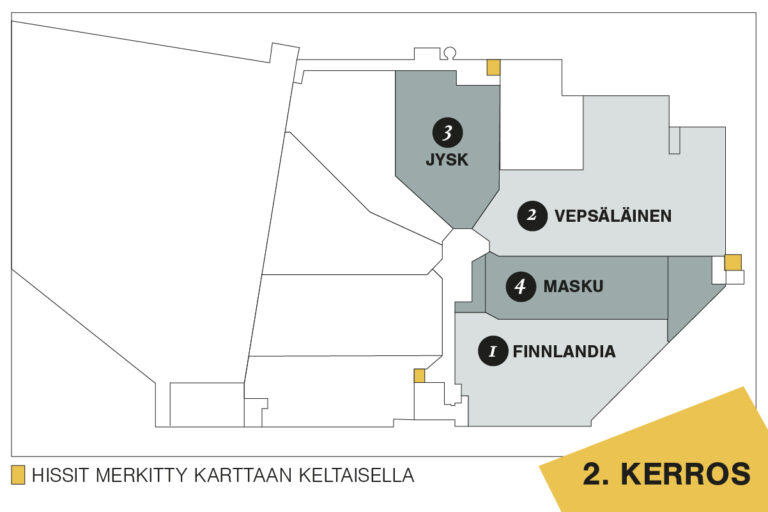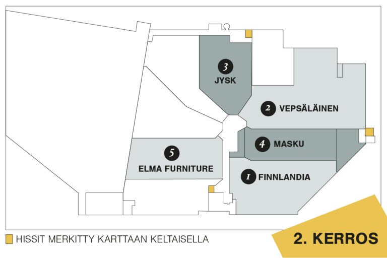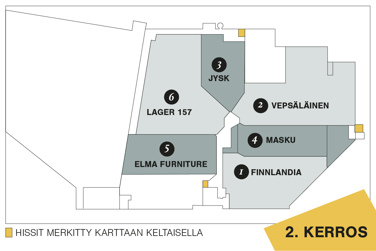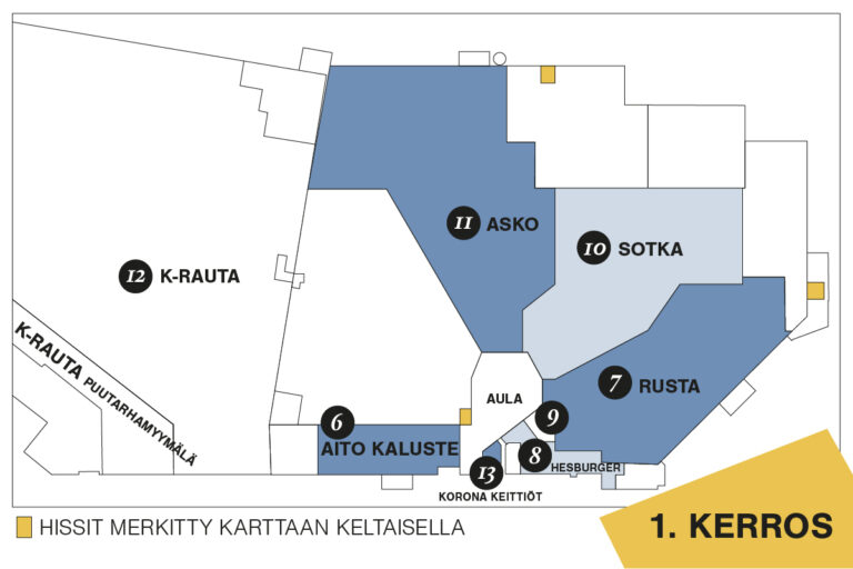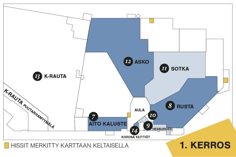 Lanternan pohjakartasta näet liikkeiden, liukuportaiden ja hissien sijainnit. Löydät liikkeet kartalta numeroiden avulla, jotka näkyvät myös oheisessa listassa.